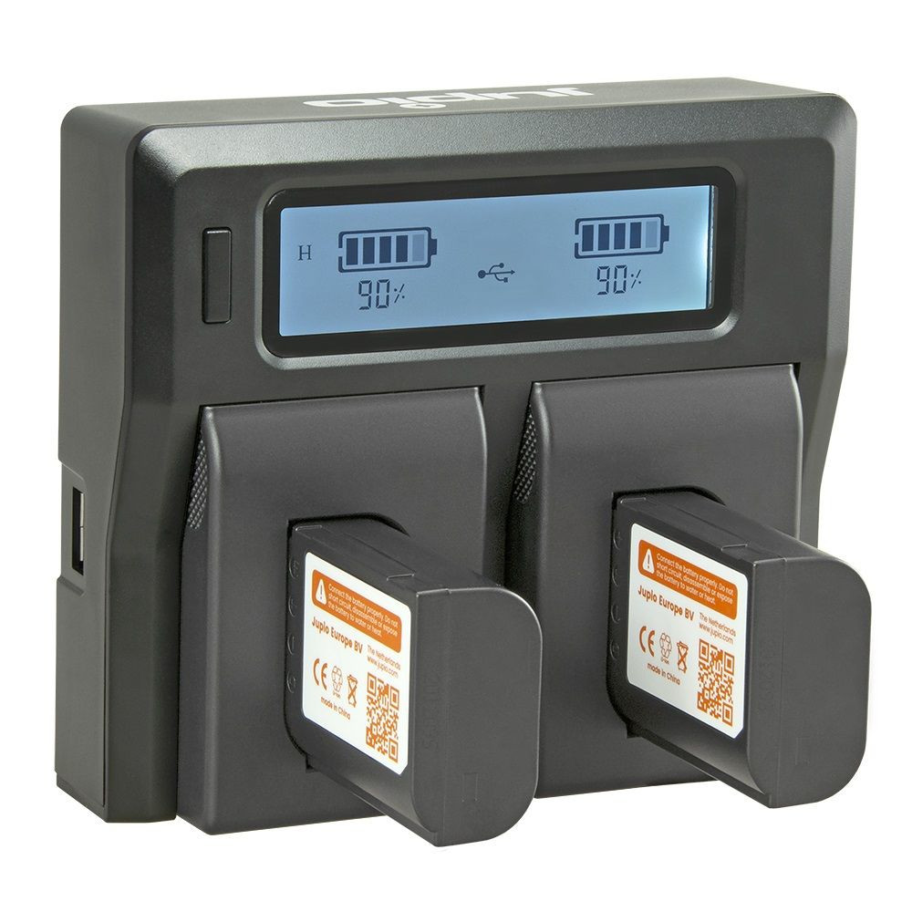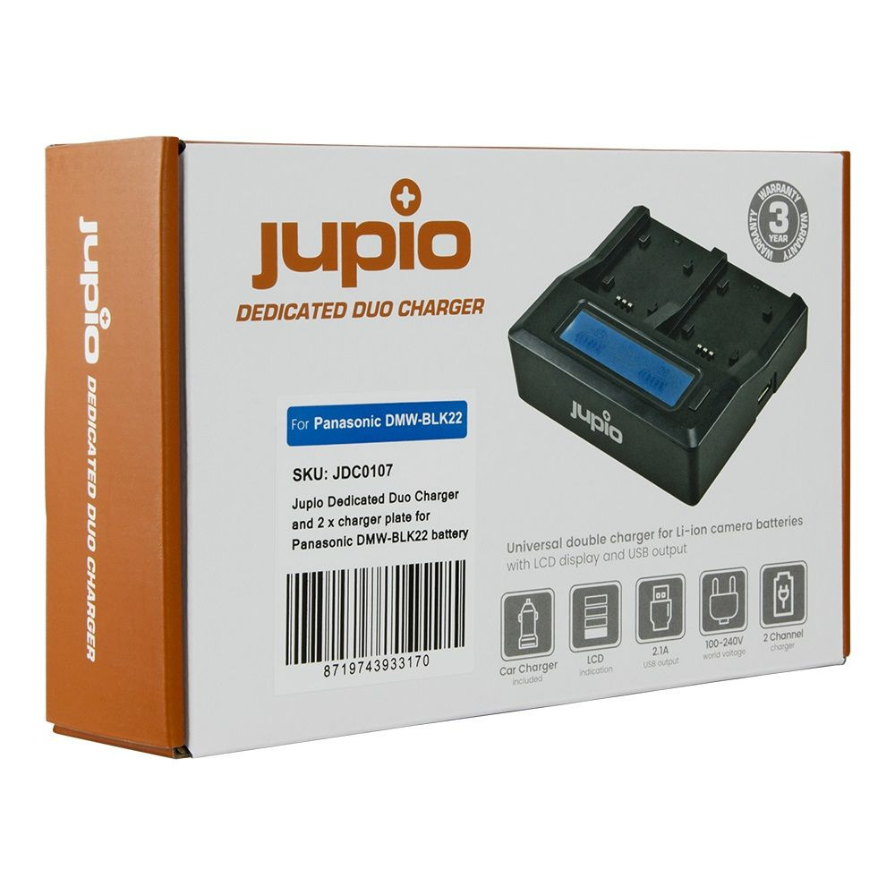 A Jupio dedikált Duo Charger egyszerre két Panasonic DMW-BLK22 foglalatban képes akkumulátorok töltésére, miközben egy fényes LCD-képernyőn megjeleníti mindkét akkumulátor állapotát. Emellett 2,1A USB Type-A kimenettel is rendelkezik amivel okostelefon vagy más mobileszköz tölthető. A Duo Charger támogatja a 100-240V-os hálózati bemenetet, és a külön megvásárolható megfelelő csatlakozó adapterrel nemzetközi szinten is használható. A készülékhez tartozik egy autógyújtó adapter (12-24 V bemenet) is, amely az út közbeni használathoz szükséges.