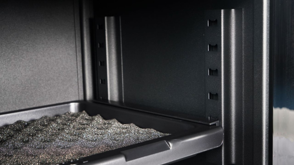 A fényes LCD-képernyő kijelzi a belső páratartalmat és a belső hőmérsékletet °C-ban és °F-ban, hogy nyomon követhesse a szekrény állapotát. A szekrény hegesztett 1,2 mm vastag acélból és légmentesen záródó, edzett üvegajtóból készült. Így a szekrény tartalma is jól védett a nedvességtől, portól és szennyeződésektől.